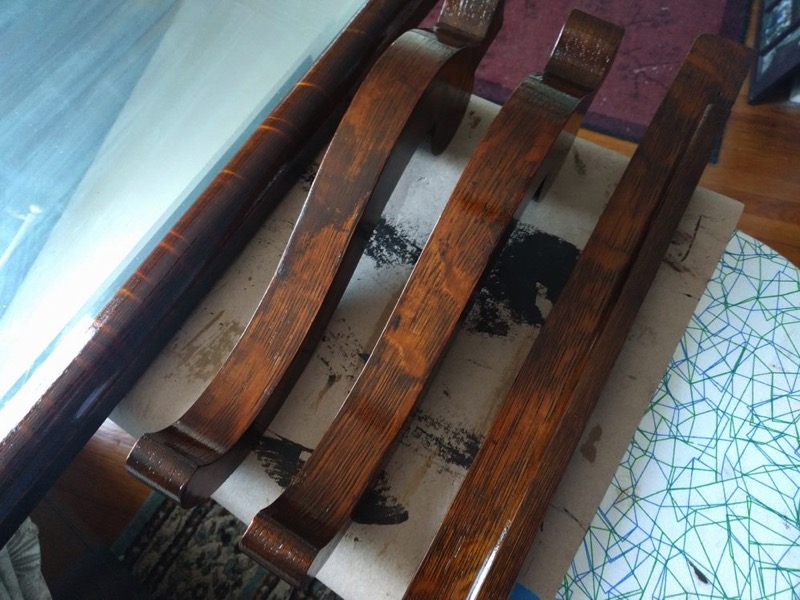 The first step is usually deconstruction, so I broke down the frame into it’s constituent parts, and scrubbed everything with denatured alcohol and 4-aught steel wool. (I was fairly sure it was finished in shellac, and denatured alcohol will dissolve shellac.) As you can see, it took off the finish and a fair amount of staining. And all the scrapes, like the one on the above photo, disappeared during this process too. (I assume, between the overall lightening, and some carried over stain, the scrapes now just blended in.) The original wood grain now stood out much more.